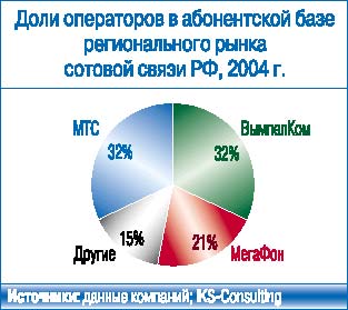 «ВымпелКом» является лидером по чистым подключениям не только в целом по России. За 10 месяцев 2004 г. оператор приобрел в 36 регионах страны больше абонентов, чем его конкуренты, у МТС и «МегаФона» таких регионов соответственно 17 и 9. Однако МТС остается лидером по объему абонентской базы в 25 регионах России («ВымпелКом»– в 20 регионах, «МегаФон»– в 15).
