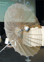 DSNG-антенна MAS-100, разработанная I.S.P.A.-SAT в сотрудничестве с НПО ПМ им. М.Ф. Решетнёва, вполне достойна стать представительницей «высокой моды» как по внешнему виду, так и по характеристикам. Компактная и легкая (примерно 15 кг), двухзеркальная антенна типа Грегори без проблем укладывается в рюкзак, а в рабочее состояние приводится за 5–7 мин. Стойкость к значительным ветровым нагрузкам (до 25 м/c) и российскому температурному режиму (–50…+50оС) обеспечивает уникальный материал рефлектора – металлическое сетчатое полотно с гальваническим покрытием. Рабочий диапазон частот – Ku. Антенна работает с VSAT-терминалами любых производителей. Один у нее недостаток: не предусмотрена ее установка на крыше. Впрочем, модели haute сouture на крыше стоять и не пристало.