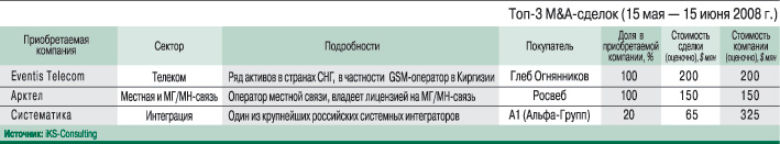 В первый месяц лета завершилось несколько интересных сделок. Одна из крупнейших – покупка оператора «Арктел» холдингом «Росвеб». Последний объединяет примерно два десятка провайдеров услуг широкополосного доступа и фиксированной телефонии, действующих в Московской области и близлежащих регионах. Сейчас «Росвеб» создает мультисервисную сеть в Подмосковье, и уже построено примерно 1 тыс. км ВОЛС – треть запланированного объема. Благодаря тому что в марте 2008 г. «Радионет», одна из крупнейших фирм в структуре «Росвеба», выпустила облигационный заем на 1 млрд руб., холдинг получил свободные средства для осуществления сделок.В июне «Росвеб» приобрел сеть «Лан-Телеком», действующую на севере Москвы. С учетом того что сейчас стоимость абонента на столичном рынке со-ставляет около $500, а «Лан-Телеком» имеет порядка 20 тыс. пользователей, сумма сделки оценивается в $10 млн. Несколько позже «Росвеб» купил компанию «Арктел», оператора, оказывающего услуги местной, междугородной и международной связи.