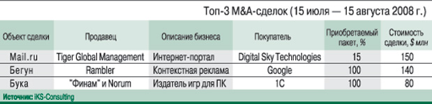 Таким образом, перепродажа интернет-активов существенно выгоднее для Rambler, чем основная деятельность. На «Бегуна» приходилось около трети оборота Rambler. Рентабельность по EBITDA «Бегуна» была выше соответствующего показателя всей компании: примерно 30% против 20%. Теперь Rambler планирует сдвинуть вектор развития бизнеса в сторону портального на-правления, для чего, например, приобрела популярный ресурс price.ru. В структуре акционеров Mail.ru, еще одного лидера российского интернет-рынка, в июле также произошли изменения: фонд Digital Sky Technology увеличил свою долю до 50,5%. Продавец – фонд Tiger Management (владеет 2,2% китайского Baidu) – до сделки контролировал 27% акций Mail.ru.