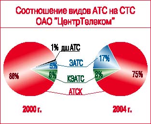 На сельских сетях «ЦентрТелекома» эксплуатируется 7 тыс. АТС общей монтированной емкостью свыше 1 млн номеров, прирост за последние пять лет – 91,9 тыс. номеров (новое строительство и модернизация АТС проводились на цифровом оборудовании). Если по итогам 2000 г. аналоговый сегмент координатного оборудования составлял 86%, а цифрового – 5%, то сегодня эти показатели соотносятся как 75% к 17%. В тличие от городских сетей на СТС с 2000 г. практически нет декадно-шагового оборудования. В последние годы активно задействовалась монтированная емкость: прирост ОТА за четыре года – 146 226 номеров.