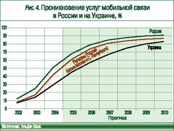 Мы рекомендуем покупать бумаги мобильных операторов (МТС и «ВымпелКома») и обращаем внимание инвесторов на то, что 2005 г. – один из последних, когда проникновение мобильной связи будет расти (по нашим оценкам, на 17 процентных пунктов – до 68% к концу 2005 г.). Также мы ждем дальнейшего расширения влияния российских мобильных операторов в пределах СНГ – речь идет прежде всего о таких странах, как Украина («ВымпелКом»), Грузия и Киргизия (рис. 4). Наши расчетные цены по АДР МТС и «ВымпелКома» – $48 и $51 соответственно.
