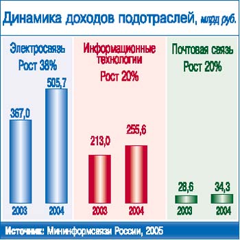 Причину роста доходов (например, от услуг связи на 38%) руководство ведомства видит прежде всего в притоке инвестиций: за последние 5 лет организации отрасли направили на развитие ИКТ 320 млрд руб., а иноинвесторы – 100 млрд руб.; в 2004 г. отечественные вложения составили $4,1 млрд (рост за год на 24,6%), зарубежные – около $1,4 млрд (рост на 100%).