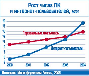 Успехи в области информационных технологий, на которые делается ставка в инновационном развитии экономики благодаря синергии с телекоммуникациями, пока скромные. Рост, как и в прошлом году, составил 20%, проникновение Интернета – 8% (в Москве – 50%) ; на 18,5 млн пользователей Сети, по данным Мининформсвязи, приходится 15 млн компьютеров (подробнее см. «ИКС» №3’2005, с. 30 – 70). Требуется целенаправленная государственная поддержка – делает вывод министр IT и связи. «Узкое горло – регулирование электронных отношений. Мы должны поменять электронное законодательство. Рынок информационных услуг является «серым». Многое есть, но немногое доступно», – считает А. В. Шаронов. По мнению руководителя Департамента информационного общества Мининформсвязи О. В. Бяхова, благоприятное стечение обстоятельств позволит стимулировать рост этого рынка до 30% в год.