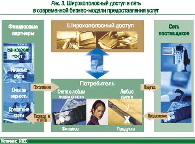 Современные бизнес-модели предполагают наличие широкополосного доступа в сеть (рис. 3). К классу услуг широкополосного доступа относятся и связанные с электронной коммерцией, и телебанкинг, и удаленное кредитование, и бонусные операции для постоянных клиентов. При всем многообразии форм смысл у всех моделей услуг один – привлечь как можно больше потенциальных клиентов, заинтересовать их воспользоваться услугами повторно. Соответственно, услуги должны стать более доступными, а их качество – удовлетворять требованиям потребителя.