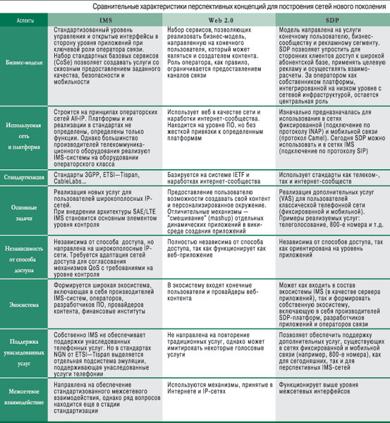 Сравним IMS-, Web 2.0- и SDP-подходы, рассмотрим их сходство, различия и возможное место в структуре традиционного оператора связи (см. таблицу).