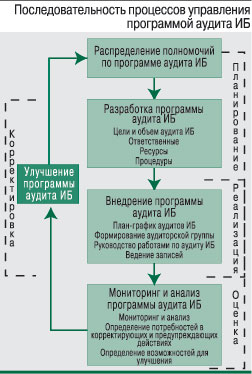 удит ИБ является одним из важнейших компонентов непрерывного цикла процессов управления ИБ организации. По форме он может быть внутренним и внешним, а по типу – аудитом первой стороны (например, внутренним), второй стороны (выполняемым аудиторами клиентов) или третьей (осуществляемым независимыми органами сертификации). Внутренний аудит ИБ проводит сама компания (или эксперт от ее имени); его результаты могут служить основанием для принятия декларации о соответствии требованиям стандартов или нормативных документов по обеспечению ИБ. Увы, для аудитов ИБ и ИС второй и третьей сторон в России пока отсутствует законодательная и нормативная база. Мало того, соответствующих правовых норм нет и в ведомствах (т.е. на отраслевом уровне), что затрудняет регулирование отношений между заказчиком и аудитором, между государственными органами аттестации и компаниями.Периодические аудиты ИБ должны предотвратить возможное нанесение субъектам информационных отношений материального, физического, морального или иного ущерба. Такой аудит позволяет обнаруживать бреши в СИБ и разрабатывать превентивные меры защиты от случайного или преднамеренного несанкционированного вмешательства в функционирование телекоммуникационных и информационных систем, от незаконного доступа к циркулирующим в них сведениям и их использования.