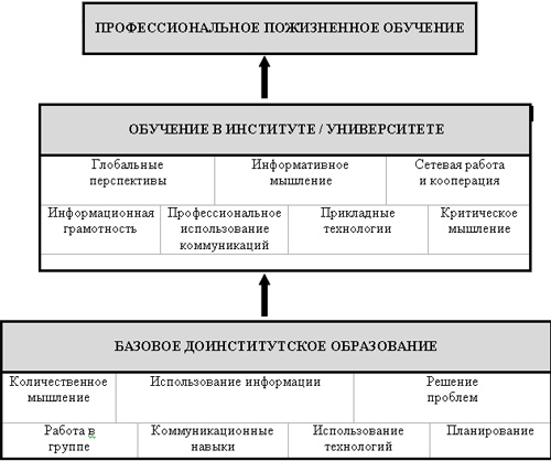 На рис. 3 приведена иерархическая модель развития базовых навыков. С одной стороны, высшее образование опирается на общие базовые знания, полученные в процессе доинститутского образования. С другой стороны, полученные навыки являются фундаментом для последующего профессионального образования в ходе пожизненного обучения.
