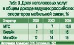 У операторов мобильной связи ситуация иная. Развитие услуг высокоскоростного доступа или кабельного ТВ сдерживается у них отсутствием инфраструктуры «последней мили». Услуги Wi-Fi хотя и оказываются ими, рассматриваются как конкурирующие по отношению к традиционным услугам передачи данных GPRS/3G. Поэтому для операторов мобильной связи наиболее перспективен рынок услуг с добавленной стоимостью (или неголосовых услуг), тем более что для развития таких услуг у них есть ряд конкурентных преимуществ: многофункциональный телефонный аппарат у абонента, гибкие тарифные планы, возможность работать с индивидуальными потребностями абонента и т. д. Это подтверждают и статистические данные: доля от предоставления неголосовых услуг в общей структуре доходов сотовых операторов растет быстрее, чем у операторов фиксированной связи (табл. 1 и 2). По данным различных источников, доля от предоставления неголосовых услуг в общей структуре дохода ведущих российских операторов мобильной связи уже в 2004. составляла в среднем 13, 6%(табл. 3).
