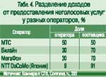 Часть своей доли поставщики услуг отчисляют правообладателям (7 – 15%) и лицензиатам (3 – 10%) (см. рис. 2). Схемы разделения доходов от предоставления неголосовых услуг у разных операторов приведены в табл. 4.