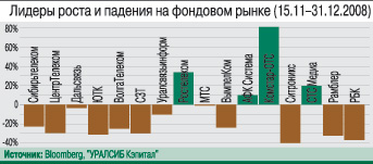 окомотивы отечественного рынка – МТС и «ВымпелКом» – продемонстрировали отрицательную динамику на Нью-Йоркской фондовой бирже: ADR МТС упали на 1%, до $27 за одну ADR, «ВымпелКома» – на 24%, до $7,2/ADR. При этом финансовые результаты компаний за III квартал 2008 г., опубликованные МТС и «ВымпелКомом» 13 и 25 ноября соответственно, не сильно повлияли на динамику котировок. Наибольшее падение котировок ADR МТС – на 14% – произошло 25 ноября. Однако негативная реакция рынка связана скорее с преодолением психологически важной отметки в $50 за баррель нефти, нежели с публикацией отчетности «ВымпелКома». Уже на следующий день котировки ADR МТС компенсировали падение 16%-ным ростом. 20 ноября были зафиксированы годовые минимумы котировок обеих компаний: $21,7 за ADR МТС и $7 за ADR «ВымпелКома».Акции МРК на ММВБ были достаточно устойчивы в отсутствие новостей о судьбе «Связьинвеста». Обыкновенные акции «Уралсвязьинформа» упали на 10%, до $0,01 за акцию, что вызвано скорее высокой ликвидностью акций этой компании по сравнению с другими МРК, чем ее финансовыми показателями. Наихудшую динамику продемонстрировали обыкновенные акции «Дальсвязи». Их котировки упали за период на 3%, до $0,58 за акцию. Падение котировок «Дальсвязи» не связано с ее отчетностью по МСФО за III квартал, опубликованной 5 декабря: у компании наиболее устойчивая позиция среди региональных телекомов по показателю Net Debt/EBITDA.