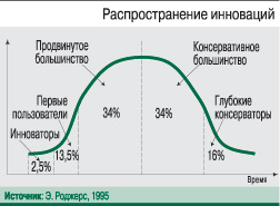 Между тем, согласно классической теории распространения инноваций (Rogers E. Diffusion of Innovations, 1960), технологически новые продукты распространяются неравномерно (см. рисунок). Вначале продукт приобретают пользователи-инноваторы, затем – так называемое продвинутое меньшинство, и только после этого можно говорить о массовом распространении товара.На восприятие новых продуктов влияют следующие факторы: