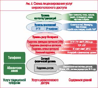 Услуга доступа к ТВ-контенту по IP-сети является, по сути, сервисом передачи данных, реализованным соответствующими приложениями (программными или аппаратными средствами), и, следовательно, не требует дополнительного лицензирования со стороны оператора. Услуги телефонной связи (с абонентами ТфОП), предоставляемые с использованием систем широкополосного доступа по технологиям IP-телефонии, характеризуются (если применять ТфОП-область регулирования) следующими особенностями: используемой в ТфОП нумерацией, возможностью принять или сделать вызов на ТфОП, а также параметрами качества (предмет межоператорского договора). Поэтому они должны регулироваться в области ТфОП аналогично традиционным услугам телефонии.