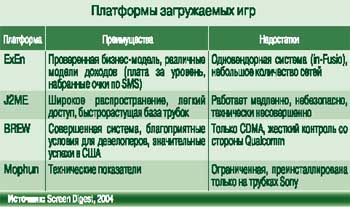 Из загружаемых игр наиболее распространена J2ME, вариант технологии Java корпорации Sun Microsystems. С J2ME успешно конкурируют и другие технологии – BREW, ExEn и Mophun. Уровень проникновения этих платформ в мире различен: Java популярна на всей планете, BREW – в США, КНР, Корее и на Тайване, ExEn – во Франции и Германии, Mophun – в Скандинавском регионе.