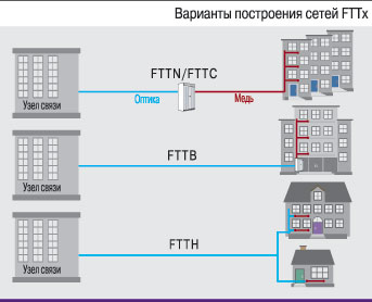 1| FTTN (Fiber To The Node) и FTTC (Fiber To The Curb). Суть этих терминов примерно одинакова: волокно от узла связи доводится до некоторого уличного шкафа, обслуживающего микрорайон, квартал или группу домов. Соответственно, для обеспечения связи от этого шкафа до домов и квартир абонентов задействуются медножильные кабели. Исторически решения FTTN/FTTC появились первыми, этот вариант кажется наименее затратным, поскольку он сохраняет б'ольшую часть имеющей медной инфраструктуры, но вместе с ней сохраняются и ее проблемы в виде низкой пропускной способности и непредсказуемого уровня наводок. Головной болью для оператора остается попадание воды в телефонную сигнализацию, низкое качество медных жил и т.п.