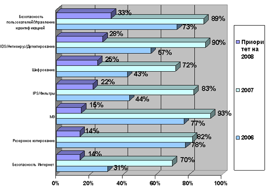 Вернемся к покупателям. Итак, практически все, что можно было купить, куплено. Введено в эксплуатацию. Снова обратимся к Глобальному отчету о ИБ PrisewaterhouseCoopers (рис.3), и увидим, что в 2007 г. у подавляющего большинства респондентов были установлены основные средства защиты. При этом приобретение тех ли иных продуктов в 2008 г. считали приоритетным от 14 до 33 % компаний (в зависимости от продукта). Есть основания предполагать, что примерно такая же картина характерна и для российских компаний, зрелых с точки зрения ИБ. Из этого можно сделать вывод: продуктовый рынок ждут трудные времена.