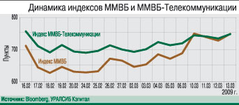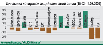 Динамика котировок российских телекомов определялась в прошедший месяц скорее тенденциями торговых площадок, нежели фундаментальными характеристиками. Так, акции МРК на российских биржах сохранили нисходящий тренд, в плюсе закрылись бумаги, торгуемые на NYSE и NASDAQ. На фоне оживления на американских рынках российские фондовые индексы продолжили умеренный рост. Так, индекс РТС с 15 февраля по 15 марта вырос на 7%, до 653 пп. (более 30% с январского минимума), а индекс ММВБ – на 5%, до 749 пп. В то же время бумаги телекома продемонстрировали отрицательную динамику: индексы РТС-Телекоммуникации и ММВБ-Телекоммуникации потеряли за месяц по 1%. На американских торговых площадках бумаги российских эмитентов (МТС, «ВымпелКом», «СТС Медиа») поддерживались оптимистичными заявлениями глав американских банков и стабилизацией цен на нефть на уровне выше $40/баррель.Важным событием месяца стал конфликт акционеров «ВымпелКома» – Telenor и Altimo, неожиданно получивший драматичное продолжение. 19 февраля Омский суд постановил взыскать с Telenor $1,7 млрд убытков от «упущенной выгоды», а 12 марта акции Telenor в «ВымпелКоме» были арестованы.