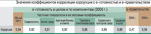 В ходе исследования «Э-готовность и э-правительство: воздействие на коррупцию», проведенного В. Дрожжиновым и А. Штриком в 2005 г. и основанного на вычислении корреляции между значениями показателей е-готовности, развития e-правительства и коррупции, между ними была установлена связь (см. таблицу).Как видно из таблицы, тесная связь между уровнем коррупции и e-готовностью очевидна (коэффициенты корреляции – от 0,86 до 0,94). При этом чем выше показатели электронной готовности, тем ниже уровень коррупции в стране. Однако результаты исследования зависимости между уровнем развития e-правительства и степенью коррупции на первый взгляд оказались неожиданными (коэффициенты корреляции – от 0,47 до 0,56). Возможно, причина в том, что авторы анализировали информацию и сайты исключительно органов высшей власти, а можно предположить, что «недостающая половина этой связи» создается региональными и местными органами власти. Иначе говоря, чиновники национального уровня несут ответственность за половину случаев коррупции в стране, а вторая половина приходится на нижние уровни управления.