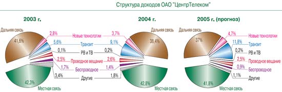 «ЦентрТелеком» находится на передовых рубежах внедрения новых технологий и услуг. В структуре его доходов растет доля услуг подключения к сети Интернет, передачи данных и ИСС. По результатам первого квартала 2005 г. новые услуги принесли компании 285 млн руб., или 4,4% всех доходов.