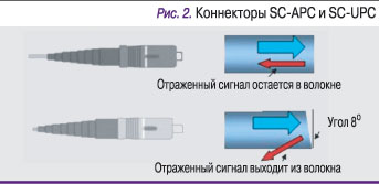 Отметим, что коннекторы основных типов выпускаются в двух вариантах: UPC (Ultra Polished Connector) и APC (Angle Polished Connector). Особенность коннектора APC в том, что его торец скошен под углом 8°, поэтому отраженная от границы часть оптического сигнала выходит из волокна. При соединении двух идеально очищенных коннекторов UPC обратного отражения не происходит, но если на границе имеется грязь, то возникают серьезные проблемы из-за отраженного сигнала. Поскольку в полевых условиях избежать загрязнения коннекторов достаточно сложно, то во внешней сети рекомендуют применять коннекторы APC, которые не ухудшают характеристик канала из-за обратного отражения. Их обычно используют и в той части внутренней сети, по которой передается видеосигнал.