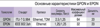 Технологии GPON и EPON различаются главным образом характеристиками активного оборудования, устанавливаемого на концах каналов: на узле связи – OLT (Optical Line Termination) и на стороне абонента – ONT (Optical Network Termination). Между этими элементами – только пассивная инфраструктура, практически одинаковая для любого варианта PON.Оборудование OLT служит своеобразным мультиплексором, обслуживающим множество соединений с устройствами ONT. Например, один порт оборудования GPON-OLT способен поддерживать до 64 абонентов (при использовании сплиттера или нескольких сплиттеров с суммарным коэффициентом деления сигнала 1:64). В результате 72-портовое GPON-оборудова-ние OLT может обслуживать до 4 608 абонентов.