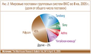 В последние пять лет в индустрии ВКС наблюдалась устойчивая консолидация – от заключения самых значимых для отрасли сделок (Polycom купил PictureTel, Tandberg – интеллектуальные права Ezenia!) до создания стратегических альянсов для использования каналов сбыта крупнейших производителей (Tandberg – Cisco). Текущий год не стал исключением: RadVision купил FVC, Polycom приобрел DSTMedia и объявил о стратегическом партнерстве с Alcatel, а Sony заявила о поддержке протокола Cisco SCCP. Одним словом, индустрия остается высококонцентрированной и, согласно бюллетеню Wainhouse Research о финансовых результатах за II квартал 2005 г. по основе отрасли – групповым системам ВКС (рис. 2), на долю двух ведущих вендоров – Polycom и Tandberg – приходится 70% мировых поставок. Позиции других компаний куда скромнее. Правда, китайские производители понемногу отвоевывают «место под солнцем», но пока в основном за счет роста внутреннего рынка.