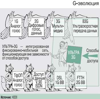 Японский оператор уверен, что будущее за связкой технологий «мобильная 3G–фиксированная DSL». Рождается новая парадигма, когда ультра-3G использует сеть общего доступа и предлагает абоненту выбрать удобный ему тип связи: IPсеть, мобильную 3G или широкополосную DSL. Кроме того, в KDDI убеждены, что широкополосная беспроводная связь станет удачным дополнением 3G в труднодоступной местности, а также в регионах, где отсутствует кабельная проводка. Очевидно, что грани между телекомом и вещанием становятся все более прозрачными, в то время как фиксированная и мобильная связь конвергируется, образуя тем самым симбиоз IP-телефонии и широкополосной связи.