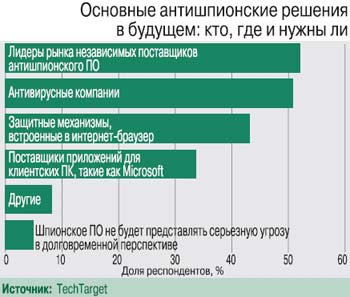 Согласно опросу, проведенному исследовательским центром TechTarget в октябре 2005 г. среди 304 сотрудников американских компаний, 38% респондентов считают шпионское ПО одной из трех наиболее актуальных проблем ИТ-безопасности, а 58% полагают, что в будущем этот вид угроз станет самым опасным. Поэтому столь актуальными становятся защита от данного вида угроз, предоставляемая независимыми поставщиками антишпионского ПО, и защита, интегрируемая в решения производителей антивирусных продуктов.