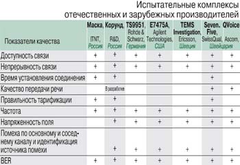 При проведении мониторинга используются испытательные комплексы отечественных и зарубежных производителей (см. «ИКС» № 5'2004, с. 96–97). Их функционал показан в таблице, где знак «+» означает возможность поддержки данного показателя качества.