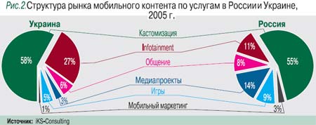 Впрочем, у украинского рынка есть бесспорное преимущество перед российским – централизованность, что позволяет достигать достаточно высокого уровня проникновения контент-услуг. В 2005 г. число абонентов, которые хотя бы единожды активизировали премиумрейт-контент-сервисы, достигло порядка 30% от общей абонентской базы. Россия и Украина: односторонняя экспансия или взаимопроникновение?