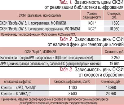 Степень защищенности. Чем выше уровень безопасности, тем дороже средство криптографической защиты. Сравним аппаратный и программный шифраторы (табл. 1). Первый имеет аппаратный датчик случайных чисел (ДСЧ), который (если средство сертифицировано) прошел соответствующую аттестацию и рекомендован к применению. Второй тоже снабжен ДСЧ, но программным, и соответственно формирует псевдослучайные числа программным образом, что снижает по сравнению с аппаратным устройством стойкость ключа, на котором шифруется информация.