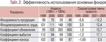 Физический объем основных производственных фондов за истекшее десятилетие увеличился почти в 1,5 раза. (Для справки: рост валовой добавленной стоимости, т.е. конечного продукта, в 2,2 раза выше, что прежде всего свидетельствует о грамотном использовании действующего оборудования.) Средний по отрасли коэффициент обновления основных фондов вырос с 1,6% в 1996 г. до 7,1% в 2005 г. (табл. 2).