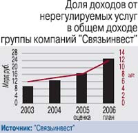«Цель – не количественное, а качественное развитие сети», – заявляет гендиректор ОАО «Связьинвест» В.Н. Яшин. На фоне роста показателей эффективности и рентабельности (к примеру, 110 линий на работника с ростом в 14% за год, валовой доход на работника в 659,5 тыс. руб. с ростом в 21%) и цифровизации (плюс 4,5% – до 55,6%) в прошлом году произошло снижение ввода фиксированной номерной емкости (2,6 млн против 3,6 млн в 2004 г.), линий передачи (12,4 тыс. км против 17,7 тыс. в 2004 г.) и значительное сокращение капвложений – 48,2 млрд руб. против 61 млрд в 2004 г. По последнему показателю «Связьинвест» сознательно шел на снижение, составившее 19%. Объяснение: осваивали вложения, сделанные в прошлые годы. Грядут и изменения в инвестиционной политике, где ставка будет делаться на новые, нерегулируемые услуги, приносящие большую финансовую отдачу. Нерегулируемые услуги уже второй год подряд называют стратегическим фокусом бизнеса. По подсчетам «Связьинвеста», среднегодовой прирост новых услуг в холдинге составляет 40% и превышает среднеотраслевой на 4%. В 2006 г. делается ставка на резкое повышение доходов от этого сектора. Задача – меньше зависеть от тарифной политики государства и, как подчеркивает глава холдинга, избавиться от «клейма монополиста» (о начале ревизии «естественно-монопольного» подхода к электросвязи см. «ИКС» № 1'2006, с. 2).