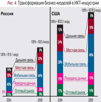 – Структура телекоммуникационного рынка неуклонно приближается к американской (рис. 4). США добились значительных успехов в области конвергентных услуг и популярной сегодня технологии triple play. Услуги triple play широко предлагают компании, эксплуатирующие сети кабельного ТВ-вещания. Сегодня они контролируют около 30% американского телекоммуникационного рынка. Условно говоря, новые игроки «уводят» традиционный связистский товар – голос.