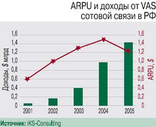 Первые четыре года нового столетия отечественный рынок дополнительных мобильных услуг демонстрировал среднегодовые темпы роста на уровне 176%, и в 2004 г. объем его приблизился к $1 млрд. Ожидалось, что по итогам 2005 г. рынок перешагнет планку в $1,5 млрд. Однако результаты всех разочаровали: общий объем поднялся лишь до уровня $1,43 млрд, доля дополнительных услуг в общих доходах операторов сотовой связи увеличилась совсем ненамного – до 13,6%, а показатель ARPU от VAS даже снизился до $1,2 (в 2004 г. – $1,5).