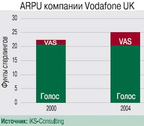 ARPU и доходы от дополнительных услуг. Несмотря на то что для российских сотовых операторов голосовой трафик останется основным генератором прибыли, стабилизация и рост ARPU в большей степени зависят от доходов от дополнительных услуг. Об этом свидетельствует западная практика. Показателен пример компании Vodafone UK, у которой за четыре года общее ARPU выросло с 22 до 25 фунтов стерлингов, причем увеличение обеспечивалось только ростом доходов от дополнительных услуг, так как голосовое ARPU за тот же период даже несколько снизилось.