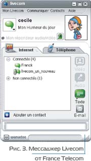 По упрощенному пути пошел France Telecom. В целях стимулирования продаж услуг высокоскоростного доступа хDSL оператор предложил «коробочный» продукт под торговой маркой Wanadoo, в состав которого входит устройство Livebox, оснащенное интерфейсами хDSL, Wi-Fi и Bluetooth, а также мессаджер Livecom (рис. 3). Приложение позволяет загружать и воспроизводить аудио- и видеоконтент со специального портала, создавать фотоальбомы, пересылать фотографии, используя сетевые адресные книги, совершать вызовы SIPтелефонии, участвовать в чатах и многое другое.