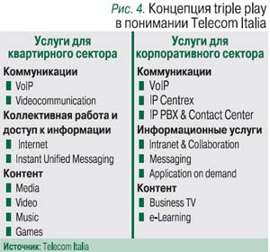 Пожалуй, наиболее четко это осознает Telecom Italia, который в ноябре 2005 г. представил новую концепцию услуг triple play, где тремя составляющими являются коммуникации, доступ к информации и коллективная работа, контент (рис. 4).