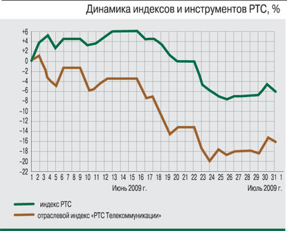 В начале июня главной движущей силой отечественных фондовых рынков было «черное золото», котировки которого штурмовали отметку $70 за баррель. Однако публикация Международным энергетическим агентством данных о фундаментальной необоснованности текущих цен на энергоносители, негативный внешний фон и понижение американским агентством Standard & Poor's рейтингов 11 российских банков стали причиной падения российских индексов. Добавил негатива и пессимистичный прогноз Всемирного банка относительно перспектив развития мировой экономики. В результате индекс ММВБ потерял 13,45% (опустившись до 972 пунктов), а номинированный в долларах индекс РТС составил по итогам месяца 987,02 пункта, что соответствует его падению на 9,32% относительно майского уровня.Телекоммуникационный сектор в течение месяца находился под давлением понижательной конъюнктуры российского фондового рынка, при этом определяющим фактором стоимости ряда бумаг сектора являлась публикация отраслевых новостей и отчетности. Несмотря на это, телеком выглядел лучше рынка в целом: отраслевой индекс «РТС Телекоммуникации» в июне потерял всего 2,55% (достигнув отметки 116,18 пункта), а индекс «ММВБ Телекоммуникации» снизился на 10,76% (до уровня 1054,84 пункта).
