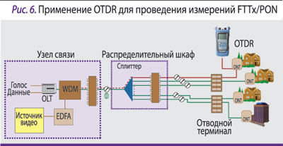 Применение OTDR для контроля сетей FTTx требует тщательной настройки измерений и оптимизации прибора под задачи указанных сетей. Причиной тому – широкое применение в сетях FTTx (в первую очередь в сетях PON) кабельных систем древовидной топологии. Если OTDR не оптимизирован под задачи тестирования PON, сигналы от разных «плеч» древовидной системы могут мешать друг другу, в результате чего полученные трассировки рефлектограмм окажутся бесполезными. На измерениях отрицательно сказывается и присутствие сплиттеров в тестируемом канале. Потери тестового оптического сигнала в процессе его отражения на сплиттере приводят к появлению характерной «ямы» на рефлектограмме, так что рефлектометр должен иметь достаточный динамический диапазон для отображения состояния кабеля после сплиттера.
