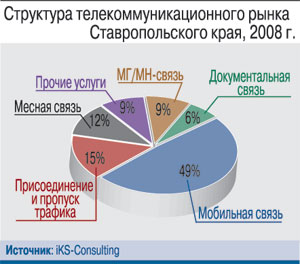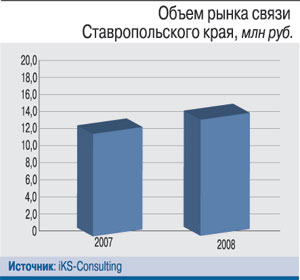 По итогам 2008 г. телекоммуникационный рынок Ставрополья превысил 14 млрд руб., пропустив вперед только более развитые рынки соседних регионов – Ростовской области и Краснодарского края.Доминирует в доходах отрасли сотовая связь. На ее долю в 2008 г. пришлось около 7 млрд руб. Количество SIM-карт, зарегистрированных в регионе, преодолело в прошлом году трехмиллионную отметку, что соответствует уровню проникновения более 110%.