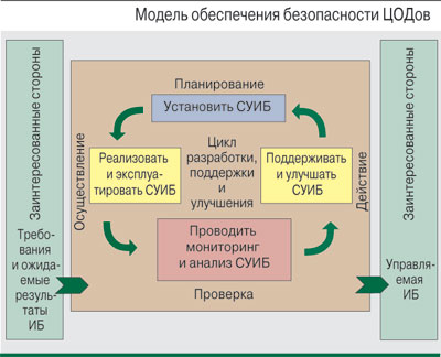 Для обеспечения безопасности информации, хранимой (обрабатываемой) в ЦОДе, следует исходить из традиционных требований ИБ: конфиденциальность, доступность, целостность. Цель обеспечения безопасности и защиты функциональных приложений, сервисов и данных (информации), работающих в рамках ЦОДа, – сведение к минимуму ущерба при возможных внешних и внутренних воздействиях, а также их предсказание и предотвращение.Основные этапы обеспечения безопасности ЦОДов типовые: построение модели угроз, выделение объектов, на которые могут быть направлены угрозы; построение модели действий нарушителя; оценка и анализ рисков; разработка и внедрение методов и средств защиты. Следовательно, без построения СУИБ как для всей информационной системы предприятия, так и для ее элемента – ЦОДа – адекватной защиты не построить.