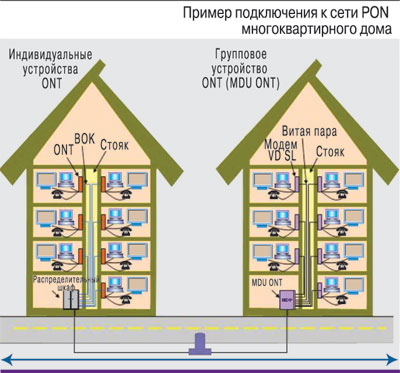 Подключение многоквартирных домов может существенно отличаться от подключения коттеджей. В частности, вполне возможно, что на многоквартирный дом оператору придется выделить не одно волокно, а несколько – для подключения большого числа устройств ONT или сплиттеров внутри здания. Во многих проектах внутри дома, например в подвальном помещении, устанавливают распределительный блок со сплиттерами, от которых волокна протягивают в отдельные квартиры. Протяжка кабелей по стояку, как правило, не вызывает особых трудностей, разве что в старых домах.Если волокно заведено в каждую квартиру, то в них устанавливают индивидуальные устройства ONT, к которым по соответствующей проводке уже подключаются абонентские устройства – компьютеры, телефоны, ТВ-приемники. Как вариант возможна установка в подвальном помещении многопользовательского устройства MDU ONT, к которому по существующей в доме проводке подключаются абонентские устройства во всех квартирах. Для подключения телефонов может использоваться витая пара категории 3, для подключения компьютеров – ЛВС на основе витой пары категории 5, для подключения телевизоров – коаксиальный кабель.