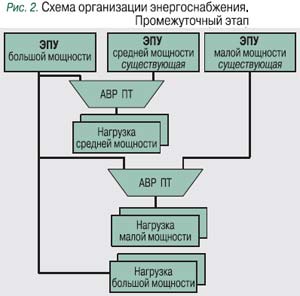 На промежуточном этапе одна мощная ЭПУ после ее установки будет постепенно переключать на себя нагрузки от источников средней и малой мощности, которые после этого демонтируются с узла связи и включаются на электропитание одиночных нагрузок: сельские АТС, выносы, базовые станции, регенераторы и т.д.