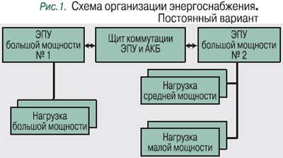 Согласно этой схеме, на начальном этапе перехода к централизованной архитектуре выпрямительной системы узла связи необходимо использовать одну мощную электропитающую установку и существующие ЭПУ средней и малой мощности одного номинала напряжения. При необходимости ответственные потребители могут резервироваться через АВР постоянного тока (АВР ПТ), выполненные на базе быстродействующих тиристоров и контакторов и управляемые с помощью программируемых контроллеров.