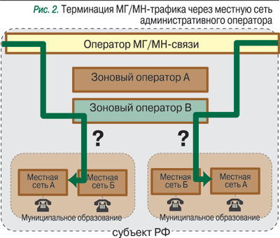 А как быть, если на территории субъекта Федерации местные и зоновые сети построили две или более компаний (рис. 2)? Может ли один оператор принимать на зоновом уровне МГ/МН-звонки, адресованные абонентам другого оператора, и передавать их последнему уже на местном уровне? К сожалению, действующие на данный момент правила пропуска трафика однозначного ответа на этот вопрос не дают.