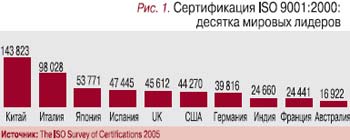 С некоторой натяжкой можно утверждать, что количество сертифицированных систем характеризует уровень менеджмента в национальной экономике. Для того чтобы в этом убедиться, достаточно подсчитать коэффициент корреляции между ВВП и количеством сертификатов ISO 9001. Однако список мировых лидеров по количеству сертификатов ISO 9001 говорит сам за себя и без сложной математики (рис. 1). Первую десятку стран уверенно возглавляет Китай с почти 150 тыс. СМК. «Серебро» досталось Италии (более 90 тыс. сертификатов). Япония, Испания, Великобритания, США, Германия, Индия, Франция имеют от 25 тыс. до 50 тыс. сертификатов каждая. Характерно, что состав лидеров по сертификатам почти полностью совпадает с авангардом мирового ВВП (за 2003 г.), как, впрочем, и аутсайдеров. Так, Гвинея, Туркменистан, Вануату и Тувалу имеют по одному сертификату соответствия ISO 9001.