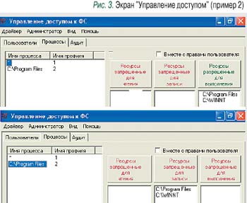 Заметим, что реализованный механизм позволяет настраивать замкнутость программной среды не только для пользователей, но и для процессов, если последний становится субъектом доступа (рис. 3). Можно разрешить любому процессу (как субъекту) запуск исполняемых файлов только из каталогов \Program Files и \WINNT (WINDOWS) и запретить процессам запись в них. Очевидное достоинство этого решения – «равноправность» разграничений для всех пользователей вне зависимости от корректности их идентификации при доступе к ресурсам (в частности, атаки на расширение привилегий становятся невозможными).