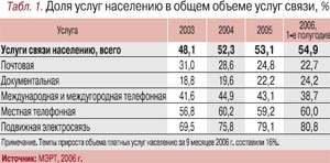 Повезло и ветеранам рынка – традиционным операторам. Введение новых правил присоединения и принципа СPP (Calling Party Pays) позволило МРК хорошо заработать на вполне традиционном поле. Так, их выручка в III квартале за СРР в среднем по России составила около 380 млн руб. Сотовики умело (мышь не подкопается!) скорректировали тарифы в свою пользу. По мнению власть предержащих, новые правила плюс измененная схема оплаты за стационарный телефон должны дисциплинировать общество. В России, где экономика асимметрична, все наоборот. Что хорошо монополисту, то малому бизнесу и населению – беда. Так, по данным МЭРТ, доля расходов населения на связь в общем объеме потребления услуг за 9 месяцев года – 19,4%, тогда как за весь 2005 г. она составила 18,4%; за 2004 г. – 17,6%; за 2003 г. – 16,7% (табл. 1).