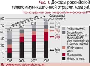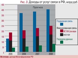 Огненный окрас - признак темперамента. Если жить азартно, с умом и по закону – дело будет спориться. В экономике отрасли вроде бы все спокойно, да и прогноз на ближайшие годы столь же благополучен (рис. 1). Так, по оперативным данным МЭРТ, за 9 месяцев 2006 г. результаты по выручке (в рублевом эквиваленте) отнюдь не хуже, чем за аналогичный период прошлого года: общие доходы сферы ИКТ выросли на 26,4% и составили 719,9 млрд руб. (без учета почтовой связи); крупные и средние предприятия отрасли (почта, электросвязь и радиосвязь) по всем видам экономической деятельности заработали 571,7 млрд руб., годовой рост составил 24,2%; услуг населению было оказано на 344,0 млрд руб., рост – 30,4% (рис. 2). Год был активным и плодотворным. Темпы роста, правда, эксперты оценивают ниже, чем в 2005 г., но сегодня этот факт относят к признакам взросления отрасли (рис. 3).